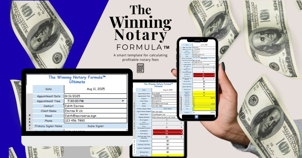 If you’re a mobile notary (general notary work or loan signings), pricing gets messy fast when you’re guessing. The Ultimate Google Sheets template helps you calculate a recommended fee using your real business inputs—so your quote makes sense for your time, your mileage, and your overhead, your goals.